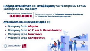 Το ΙΝΕΔΙΒΙΜ προχωρά δυναμικά το έργο της ανακαίνισης και αναβάθμισης των Φοιτητικών Εστιών ιδιοκτησίας του. Στην παρούσα φάση, βρίσκονται σε εξέλιξη οι δημόσιοι διεθνείς διαγωνισμοί των μελετών για την πλήρη…