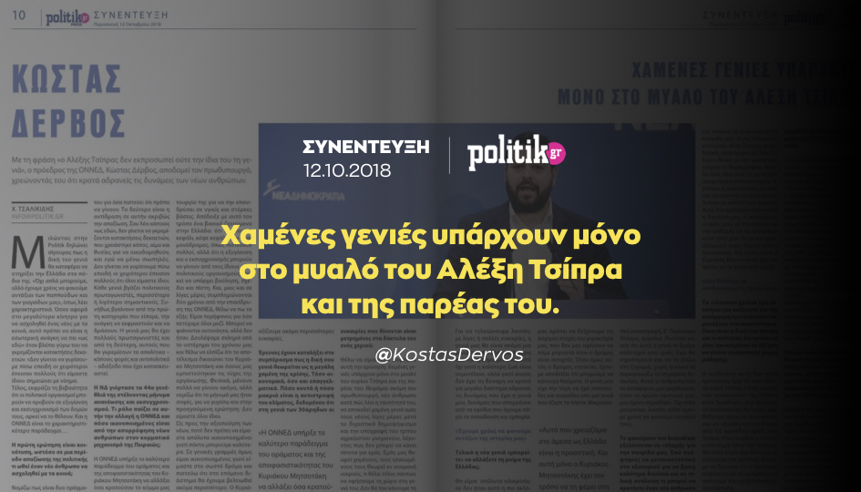 Θα είμαι απόλυτα ειλικρινής: αν δεν ήταν αυτό η πιο ακλόνητη πεποίθησή μου, δεν θα ήθελα να είμαι πρόεδρος της μεγαλύτερης πολιτικής νεολαίας. Οι Έλληνες πολλές φορές μας αρέσει να δείχνουμε τις άσχημες πτυχές του χαρακτήρα μας, που δεν μας αφήνουν να πάμε μπροστά όταν ο δρόμος είναι ανοιχτός. Όταν όμως αυτός ο δρόμος στενεύει, έχουμε αποδείξει ότι μπορούμε να κάνουμε θαύματα. Η γενιά μου είχε την τύχη να έχει παππούδες και γιαγιάδες από μια γενιά που έζησε τα πάντα: Μικρασιατική καταστροφή, Β’ Παγκόσμιο Πόλεμο, Εμφύλιο. Πιστεύει κανείς ότι αυτή η γενιά τα βρήκε καλύτερα από εμάς; Εγώ θα ντρεπόμουν και να τα βάλω στη ζυγαριά, χωρίς φυσικά να παραγνωρίζω τις σημερινές δυσκολίες. Αυτοί οι άνθρωποι που τα κατάφεραν μας μεγάλωσαν, ήταν τα πρώτα πρότυπά μας, μας έχουν σημαδέψει. Όχι απλά μπορούμε, λοιπόν, αλλά έχουμε χρέος να φανούμε αντάξιοί τους.