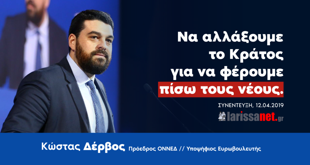 Ο Κώστας Δέρβος, πρόεδρος ΟΝΝΕΔ και υπ. ευρωβουλευτής της ΝΔ μιλάει στην larissanet για το τί πρέπει ν’ αλλάξει στην Ε.Ε. ώστε αυτή να γίνει πιο φιλική στον πολίτη μετά την θολή εικόνα που παρουσίασε τα χρόνια της κρίσης με αποτέλεσμα να αυξηθούν οι ακροδεξιές φωνές στους κόλπους της. Υποστηρίζει ότι η περισσότερη δημοκρατία είναι η απάντηση σε αυτό το φαινόμενο. Από την άλλη περιγράφει τα βήματα που θα μπορέσουν να οδηγήσουν τους νέους που έφυγαν πίσω στην πατρίδα ώστε να μπορέσουν να συμβάλουν στην ανάπτυξη της χώρας.