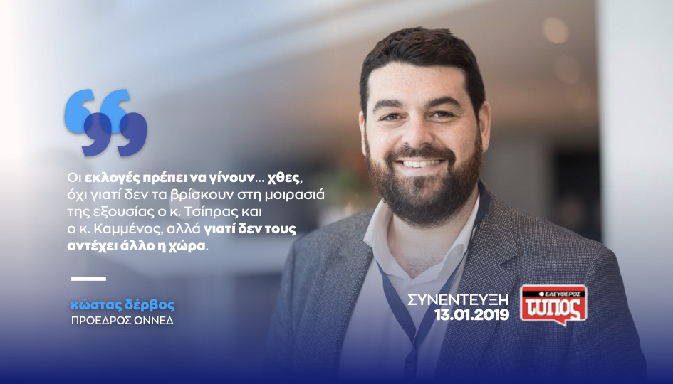 «Οι εκλογές πρέπει να γίνουν… χθες, όχι γιατί δεν τα βρίσκουν στη μοιρασιά της εξουσίας ο κ. Τσίπρας και ο κ. Καμμένος, αλλά γιατί δεν τους αντέχει άλλο η χώρα», τονίζει ο πρόεδρος της ΟΝΝΕΔ, Κώστας Δέρβος, σε συνέντευξή του στον Ελεύθερο Τύπο της Κυριακής. Ο κ. Δέρβος εκτιμά ότι «ως οργανισμός, η Ν.Δ. κερδίζει τη νέα γενιά», επισημαίνει ότι «δεν είμαστε όλοι ίδιοι, όπως θέλει να μας πείσει ο κ. Τσίπρας υποβαθμίζοντας καθημερινά το επίπεδο του δημόσιου διαλόγου» και αναφέρεται στην ανάγκη για «σύγχρονες και εξειδικευμένες θέσεις εργασίας, που θα έρθουν μέσα από επενδύσεις και πραγματική ανάπτυξη».